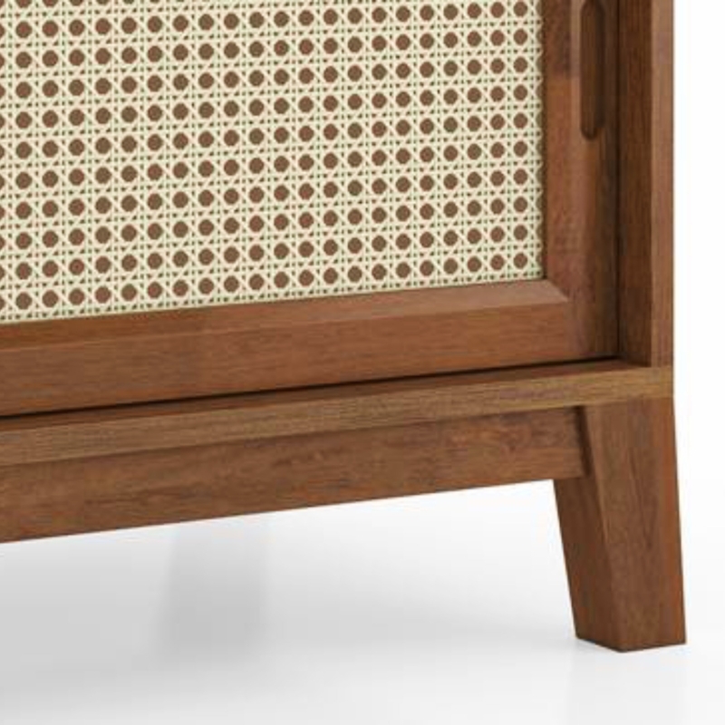 • Made from mango wood, cane, glass, and MDF