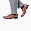 • A pair of brown textured round-toe formal slip-ons has regular styling, with slip-on closure