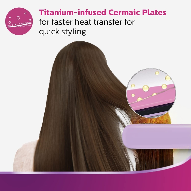 • Quick and smooth styling with ceramic plates infused with titanium allows for fast heat transfer and smooth gliding through the hair